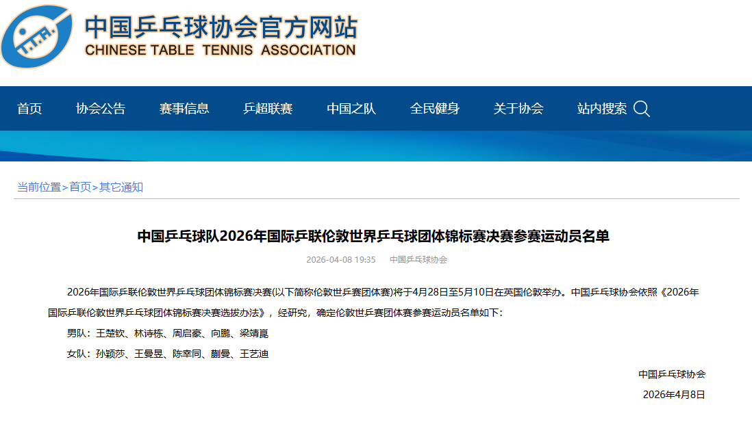 中国乒乓球协会8日在官网公布了伦敦世乒赛团体赛中国队参赛名单。国乒参赛名单为男队:王楚钦、林诗栋、周启豪、向鹏、梁靖崑;女队:孙颖莎、王曼昱、陈幸同、蒯曼、王艺迪。伦敦世乒赛团体赛将于4月28日至5月10日进行。
