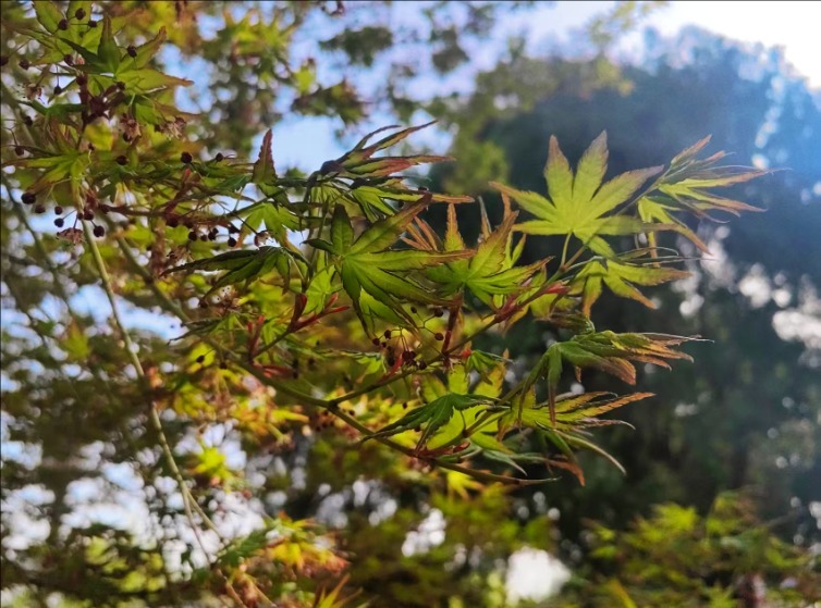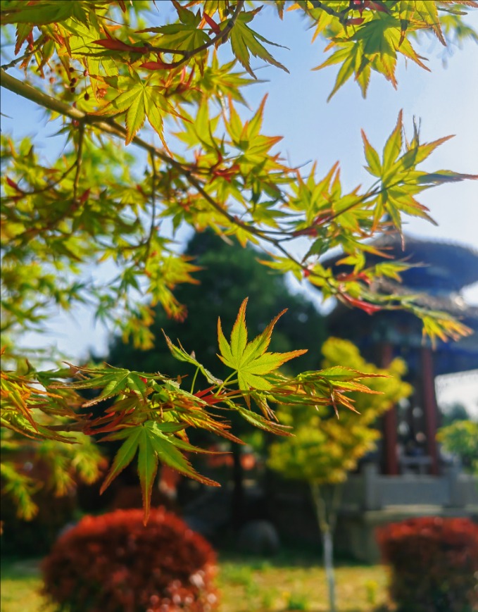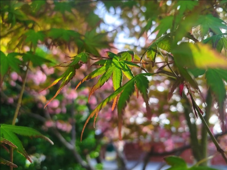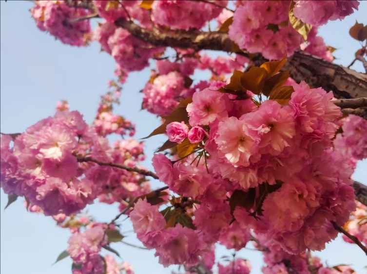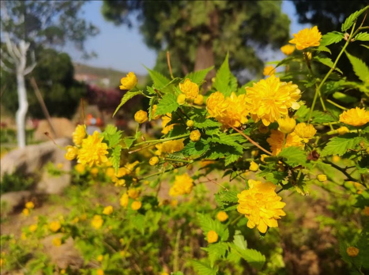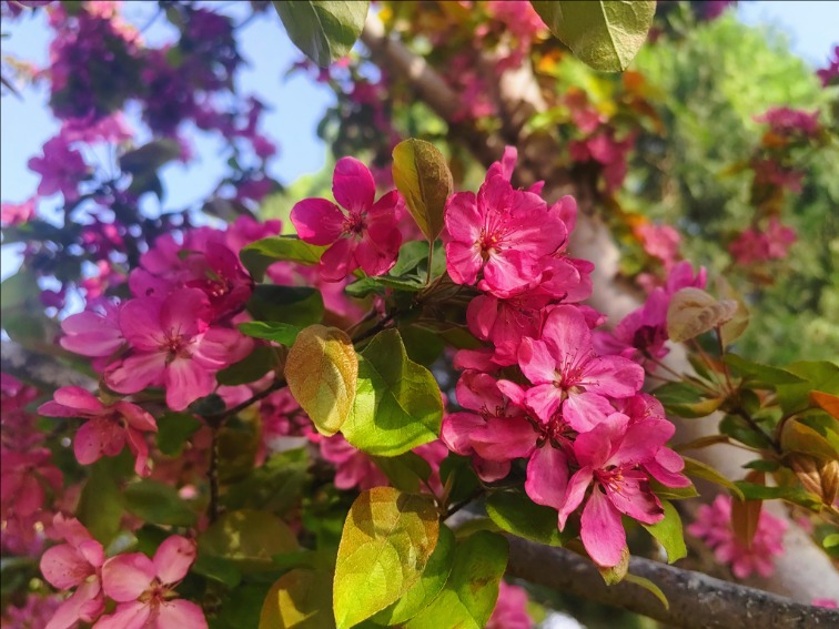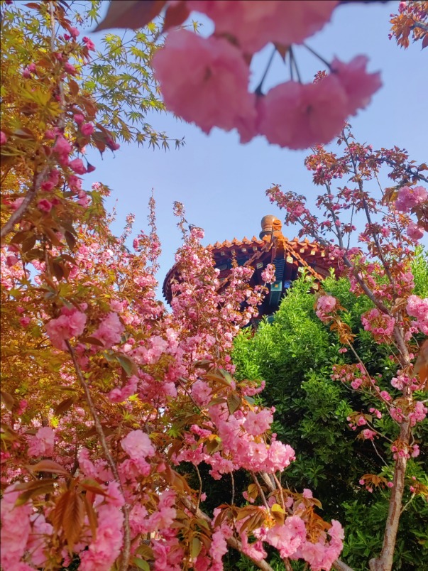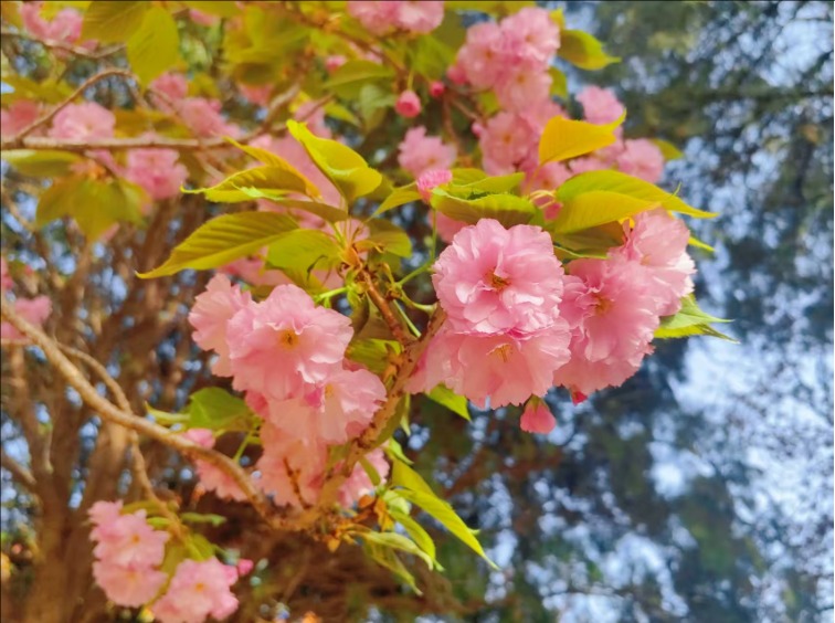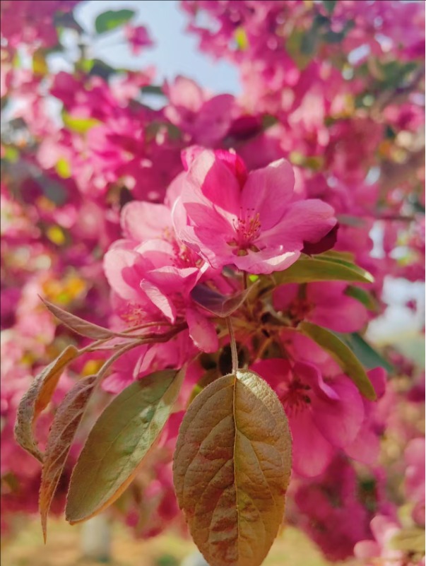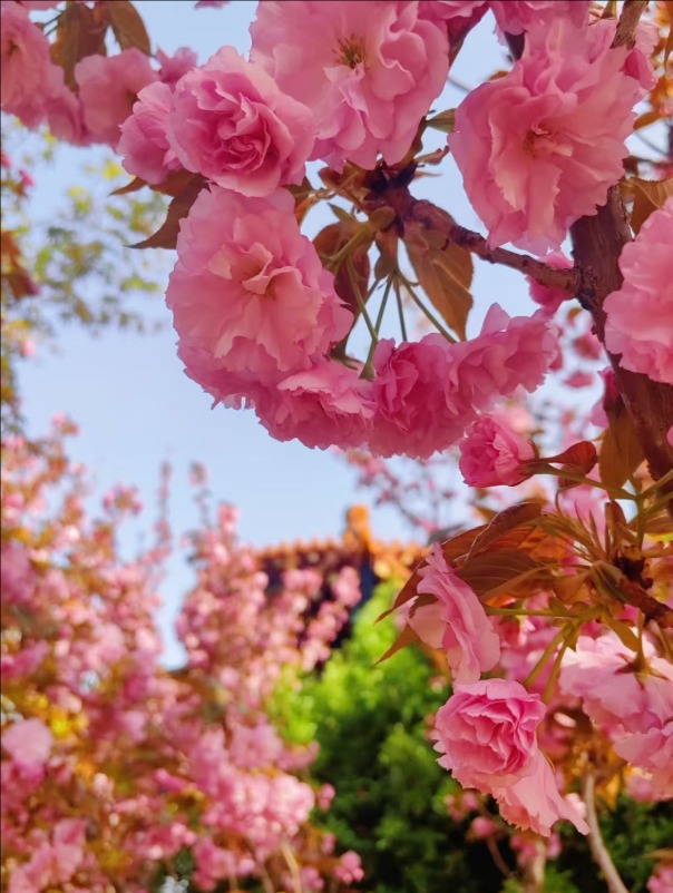 漫步虎山公园,北美海棠花色浓郁,密密匝匝地缀满枝头,远望如云霞漫卷,近观娇俏温润;菊花桃形态别致,披针形花瓣轻盈舒展,在阳光下熠熠生辉;晚樱开得热烈烂漫,花团锦簇、随风轻摇;棣棠花一簇簇金黄明亮,点缀在绿树青草间,明媚又鲜活。