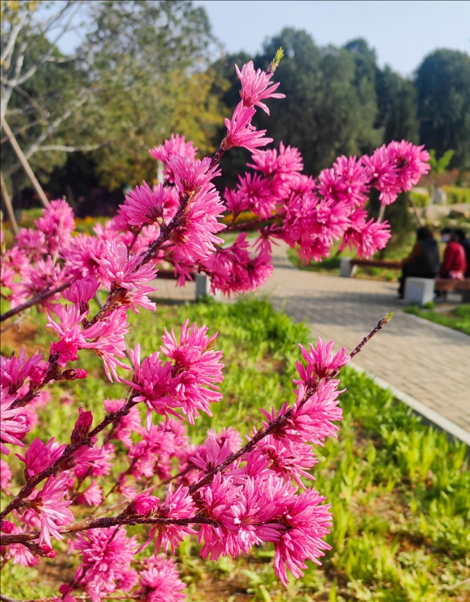 红粉相间、黄绿交织,虎山公园里各色景致错落有致,花香随风弥漫,游人络绎不绝。大家或沿步道悠闲漫步,或在花前驻足观赏,或拿起手机相机定格美景,在一步一景间,感受虎山公园独有的春日魅力与自然生机。