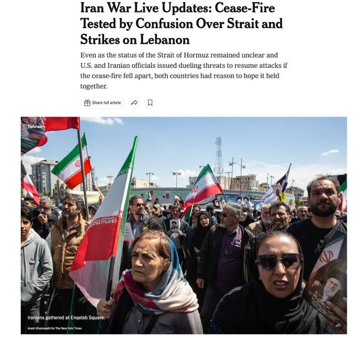 △《纽约时报》报道,美伊之间刚生效一天的停火面临考验,美伊官员互相威胁