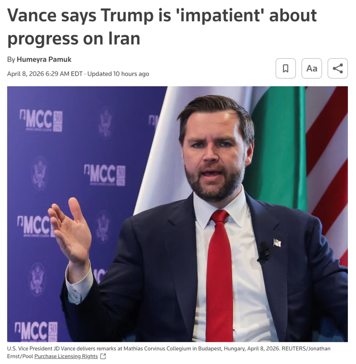 而按万斯4月8日最新说法,当前围绕谈判基础甚至已经出现了三份不同“10点提案”。万斯称,最早提交给威特科夫等人的那一份已被美方彻底否决,随后又出现了第二份“更合理”的版本。至于社交媒体和伊朗官员口中流传的另一份“10点提案”,他则批评其内容更加极端。与此同时,白宫新闻秘书莱维特表示,伊朗最初版本的提案“根本不严肃”,后来才向美方递交了一份“更合理、变化很大”的新版本。这意味着,即便谈判窗口已经打开,究竟围绕哪一份文本展开真正谈判,目前各方公开口径也并不一致。